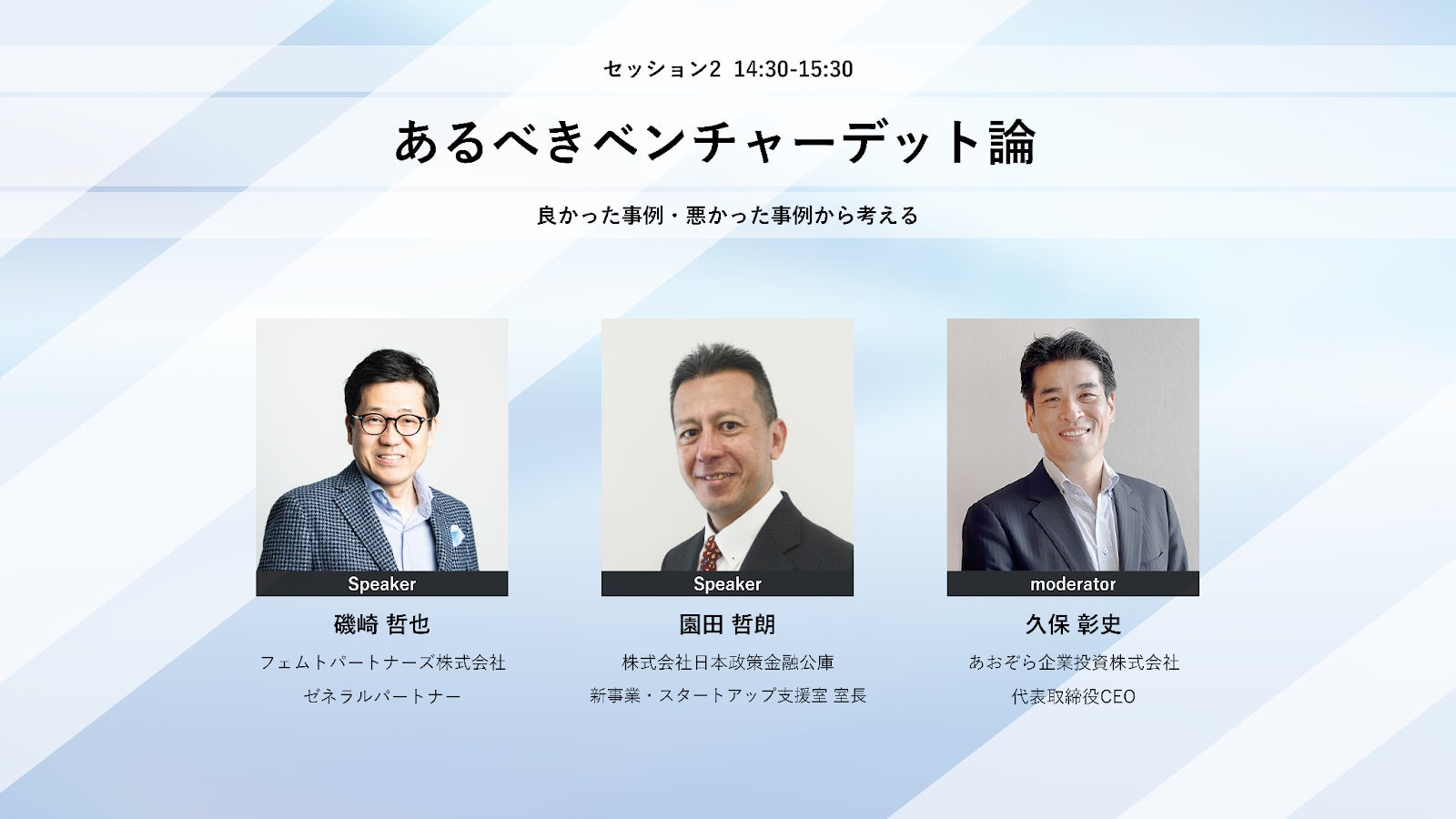 その役割・利用シーンが拡大しているベンチャーデットですが、本セッションでは、具体的に寄せられている"実際に利用してみてのポジティブ、ネガティブな声"を、スタートアップ、VC・株主、ベンチャーデットレンダーそれぞれの立場で掘り下げ、これからの”あるべきベンチャーデット”を展望します。