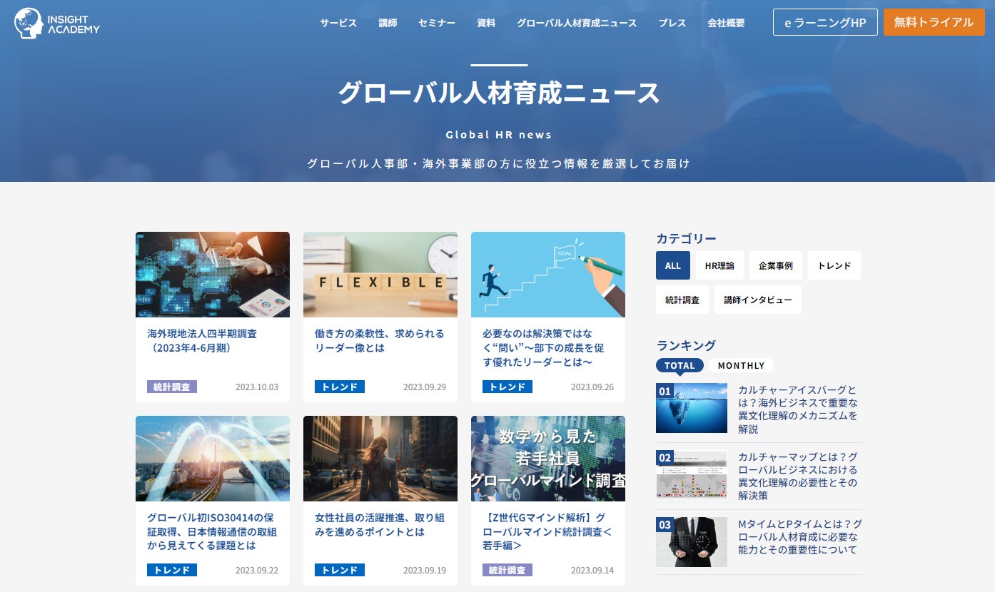 HR理論・企業事例・トレンド・統計調査・講師インタビューに分類し、グローバル人材育成ご担当の方に役立つ情報を厳選&解説してお届け。カテゴリーやランキング等を追加し、さらに分かりやすくなりました!