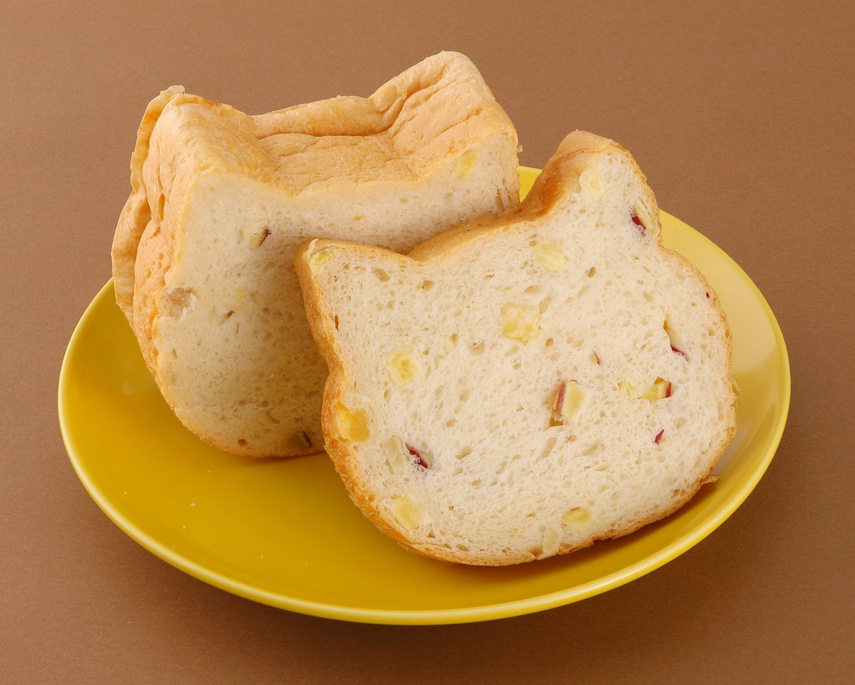 茨城県産紅はるかを生地に混ぜ込みさつまいものダイスを加えた、ねこ型食パンです。