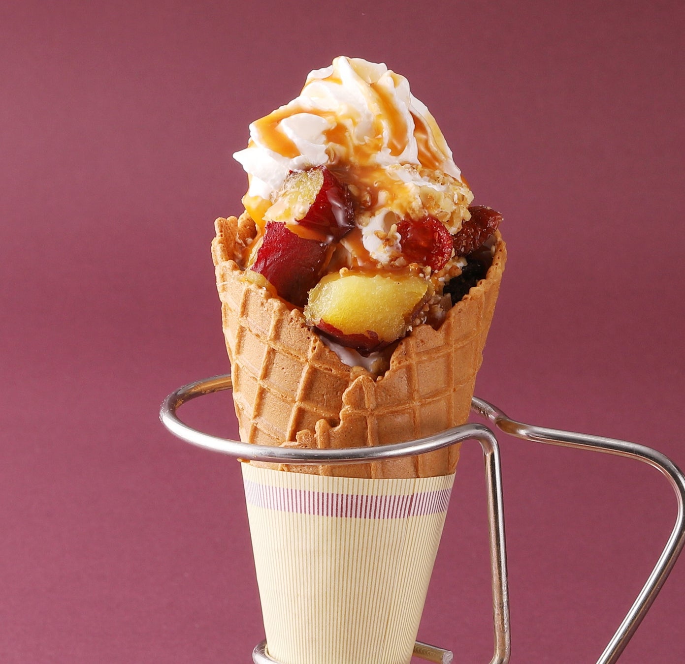 人気商品の牛乳ソフトに茨城県産の紅優甘とグラノーラ、キャラメルソースをトッピングしたソフトクリームです。
