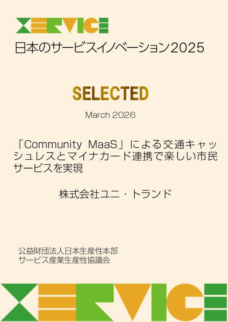 株式会社ユニリタ(東証スタンダード市場:3800、以下 ユニリタ)のグループ会社で、持続可能な地域社会の実現に向けて交通・物流の課題をデジタル技術で解決する株式会社ユニ・トランド(本社:東京都港区、代表取締役社長 高野 元、以下 ユニ・トランド)が提供する「Community MaaS」が、公益財団法人日本生産性本部のサービス産業生産性協議会(所在:東京都千代田区、代表幹事:小林 喜光、以下 サービス産業生産性協議会)が主催する「日本のサービスイノベーション2025」の事例に選出されました。