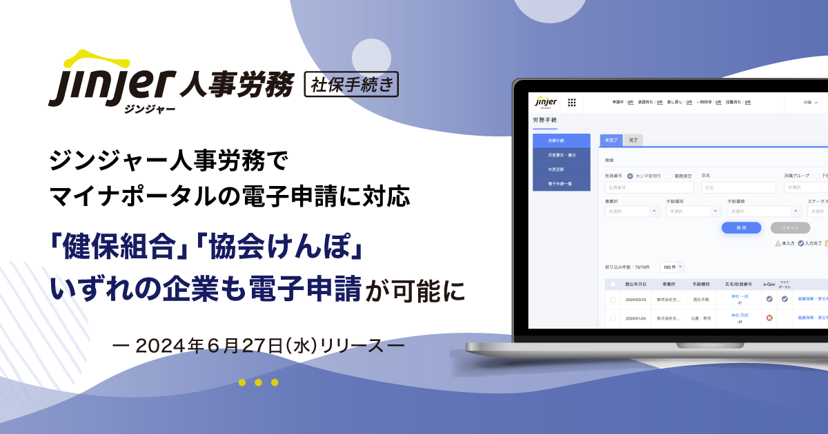 今回、マイナポータルを利用した電子申請が対応可能となったことから、中規模~大規模の企業が主に加入している健康保険である「健保組合」においても、健康保険に関する電子申請が「ジンジャー」上にてできるようになりました。これにより、保険者が「健保組合」「協会けんぽ」のいずれの企業においても、e-Gov/マイナポータルを利用して、健康保険に関する電子申請が「ジンジャー」上で申請・管理が可能になります。