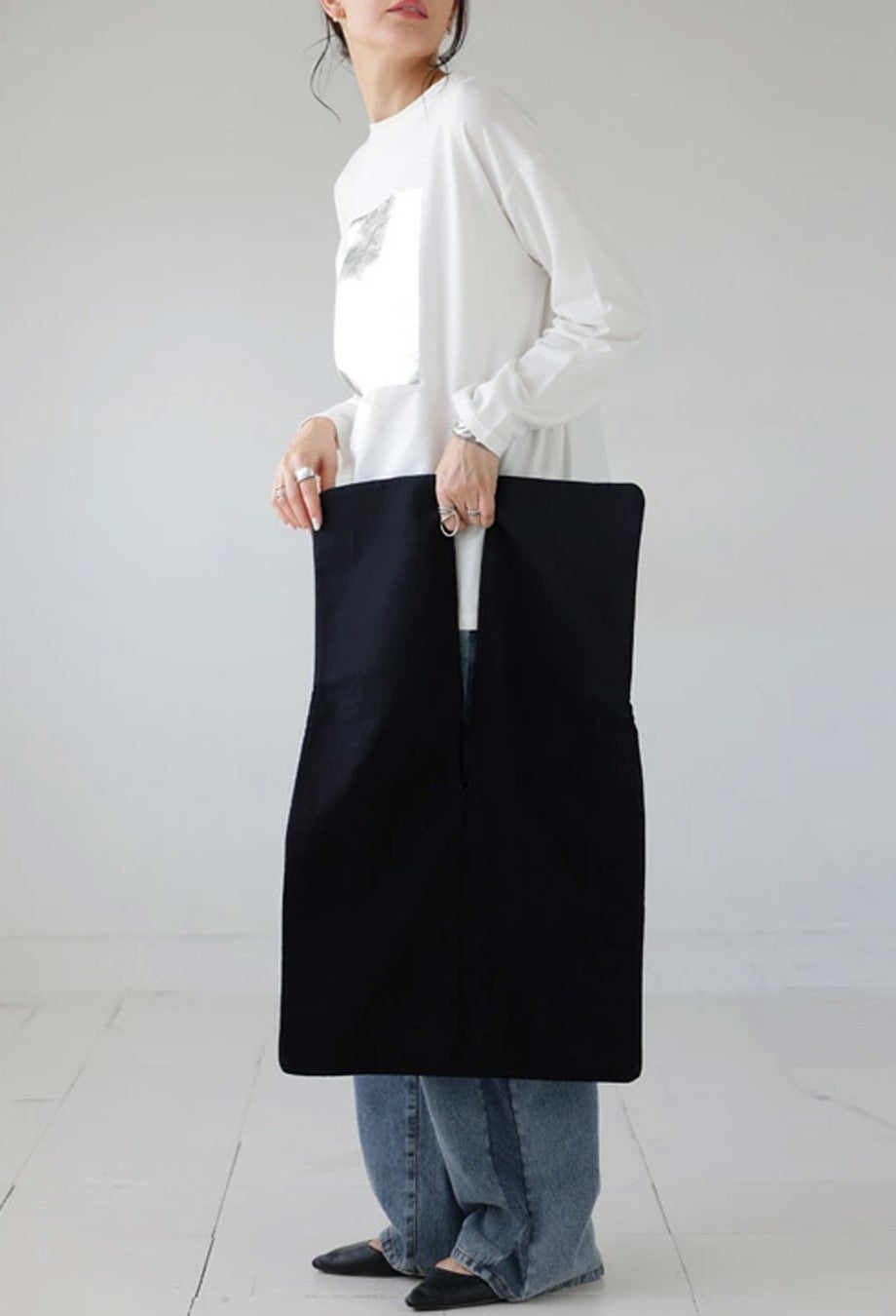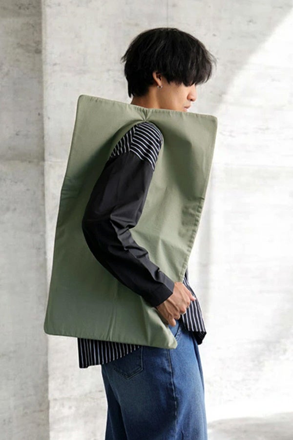 長方形の布からパターンを作る「REC」シリーズから肩掛けバッグが新登場。バッグ中央の切れ目に腕を通し、物の出し入れも同じオープニングから。肩掛けの余った布は襟のようにもなり、新しいシルエットを作り出す。大きめなサイズ感でDJのようにレコードを入れて型紙代わりにしても良し、好きなものを入れてお出掛けにも最適。肩にかけても手に持ってもサマになるから、コーデのワンポイントプラスとしてその日のムードを変えられる。