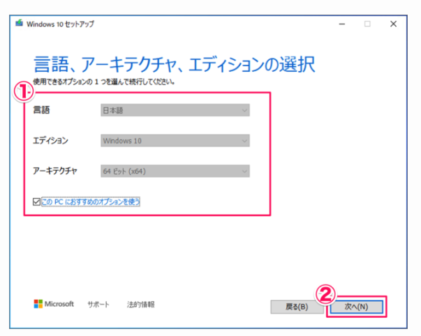 Step5:「言語、アーキテクチャ、エディションの選択」をそれぞれ選択し、「次へ」へ進みます。