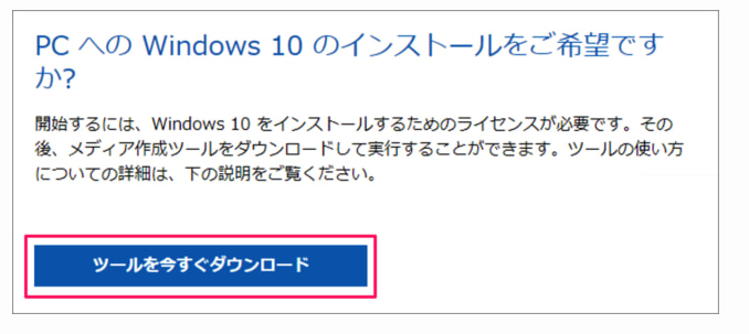 Step1:「Windows 10のダウンロード」へアクセスし、「ツールを今すぐダウンロード」をクリックします。