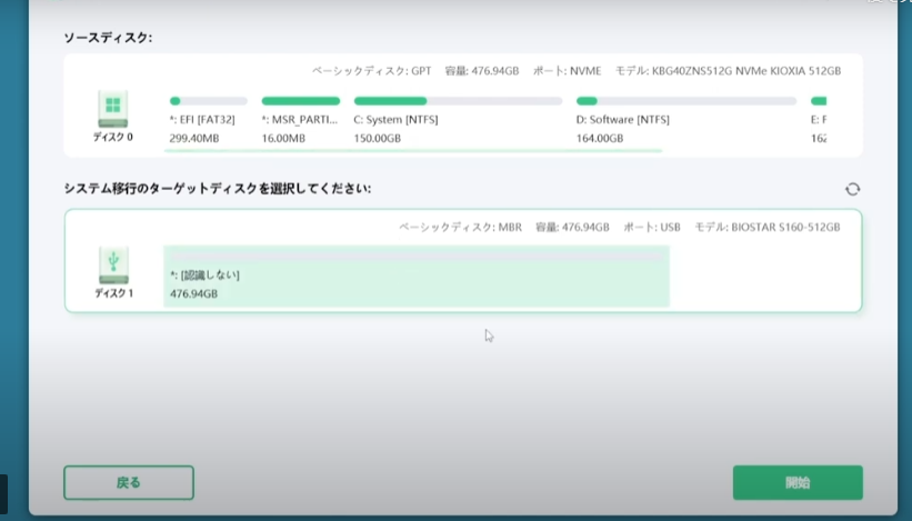Step2:「ソースディスク」は移管元を「ターゲットディスク」は移管先を指します。それぞれを選択し、「開始」をクリックしてください。