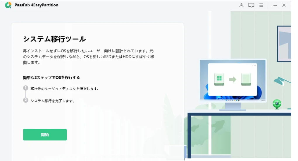 Step1:パソコンに「PassFab 4EasyPartition」をインストールし起動します。以下の画面が表示されたら「開始」をクリックしてください。