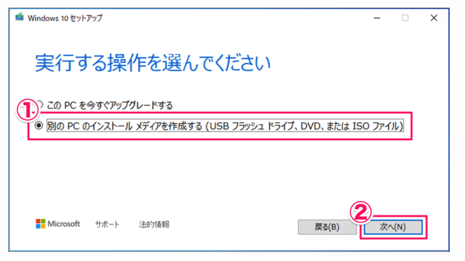 Step4:以下の画面で「別のPCのインストールメディアを作成する」を選択し、「次へ」へ進みます。