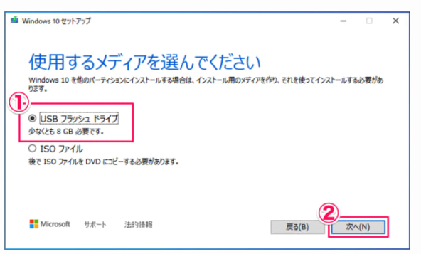 Step6:次に、メディアの媒体を選択します。ここではUSBをブータブルメディアとし、「次へ」に進みます。次の画面では該当のUSBを指定します。