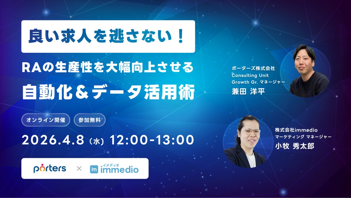 株式会社immedio(本社:東京都渋谷区、代表取締役:浜田 英揮)は、2026年4月7日(火)、ポーターズ株式会社と共に、人材紹介事業の生産性を劇的に向上させるオンラインセミナー『良い求人を逃さない! RAの生産性を大幅向上させる 自動化&データ活用術』を開催いたします。