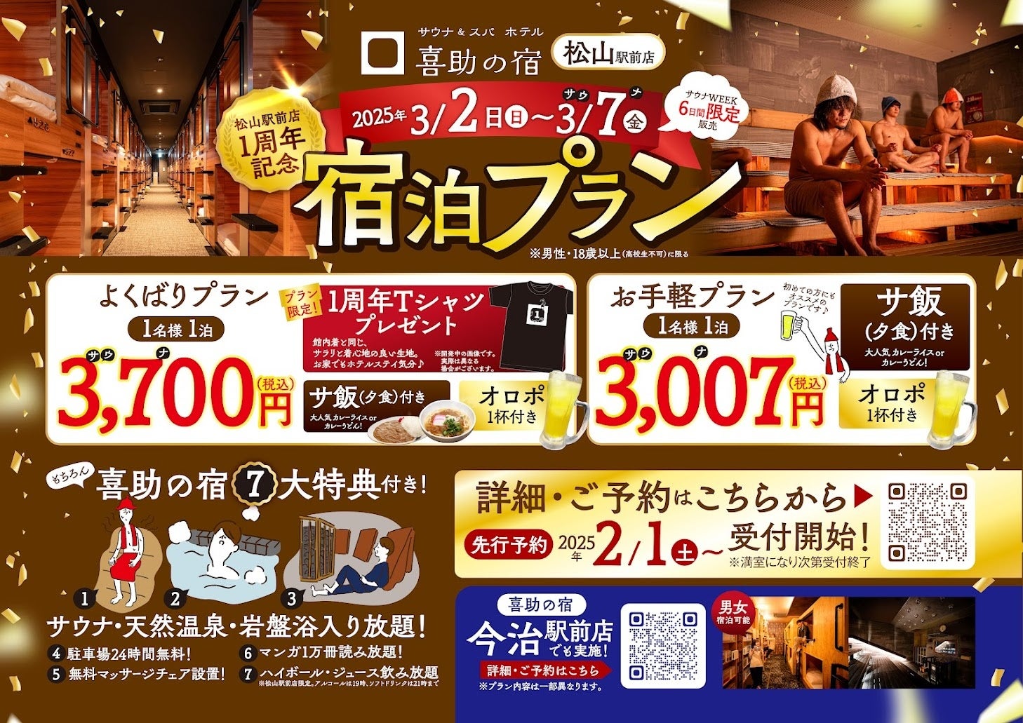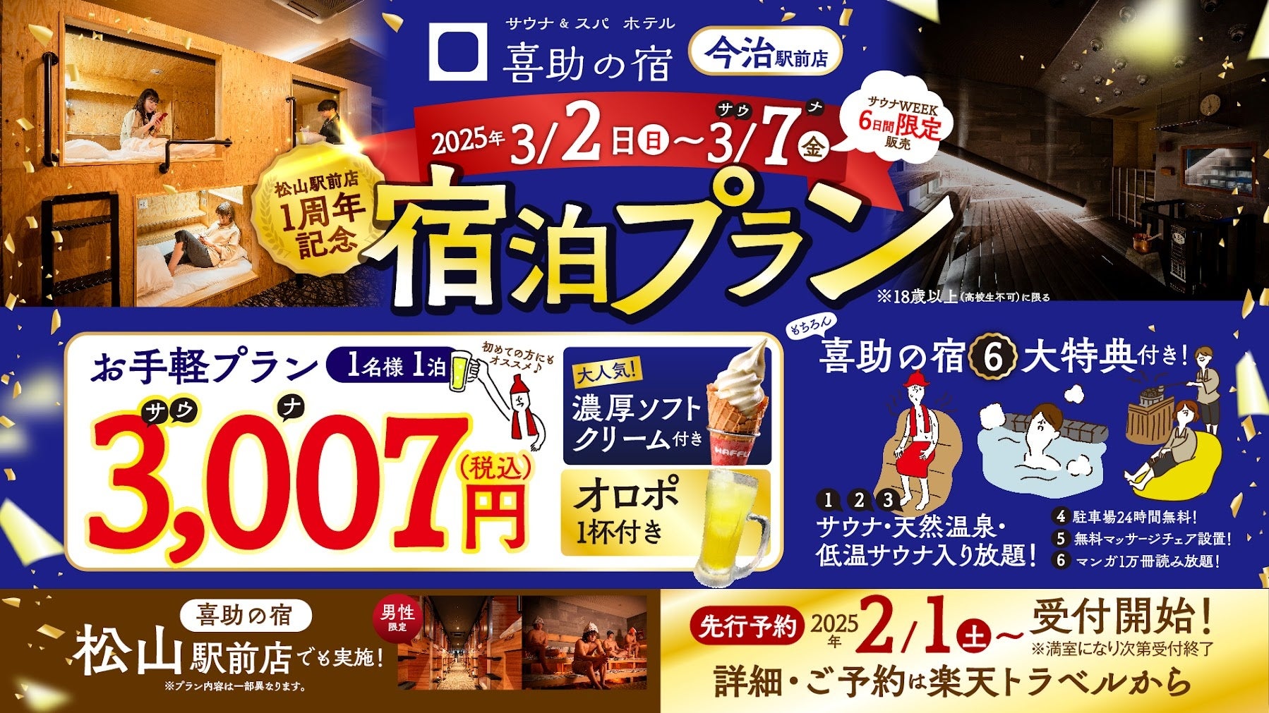 総合エンターテインメント企業・キスケ株式会社が運営する「サウナ&スパホテル 喜助の宿」は、2025年3月2日(日)~7日(金)に松山駅前店の開業1周年を記念して特別プランを2025年2月1日より先行予約を開始!サウナにちなんだ3,007円と3,700円の特典の異なる2つのプランをご用意いたしました。是非この機会にサウナ&スパホテル 喜助の宿をご利用ください。
