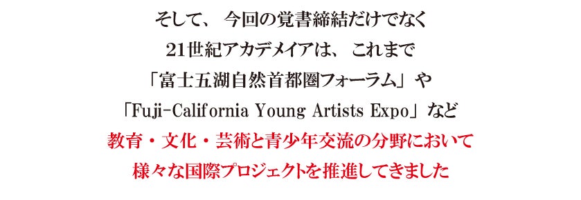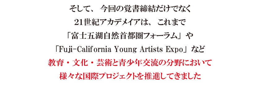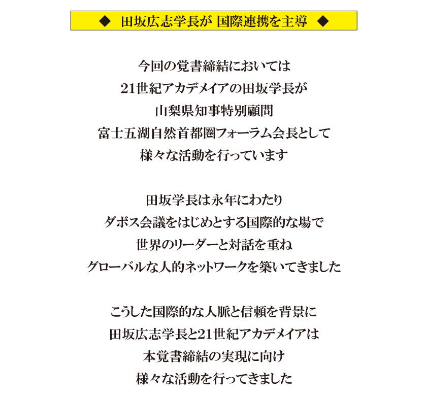田坂学長が、山梨県知事特別顧問として本覚書の締結に尽力。ダボス会議などで築いた国際的な人脈と信頼を背景に、学長および21世紀アカデメイアが、この国際連携の実現に向け尽力しました。