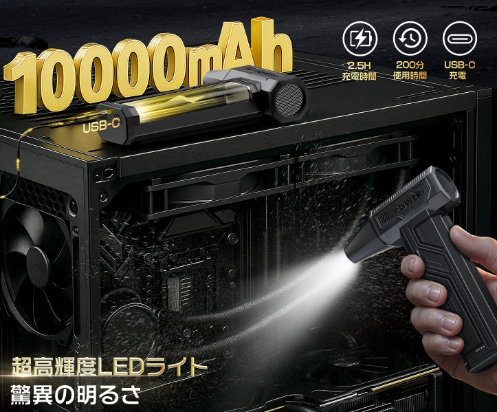 10000mAhバッテリー搭載:最大200分の連続使用が可能、USB-C急速充電対応