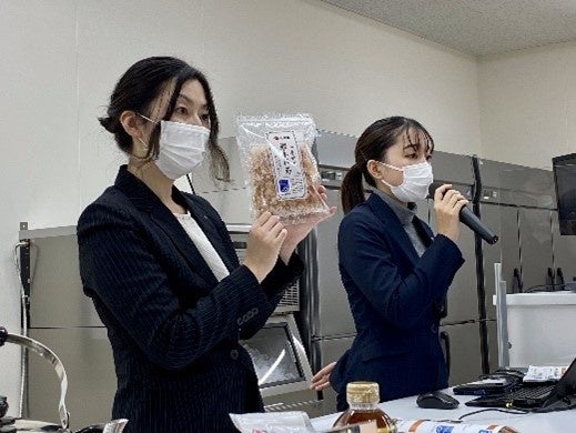 「かつお節を知ろう」講義では、かつお節の歴史や製造工程についてヤマキ社員から動画を交えて説明。参加者は、削る前のかつお節や様々な商品を手に取りながら熱心に耳を傾けていました。