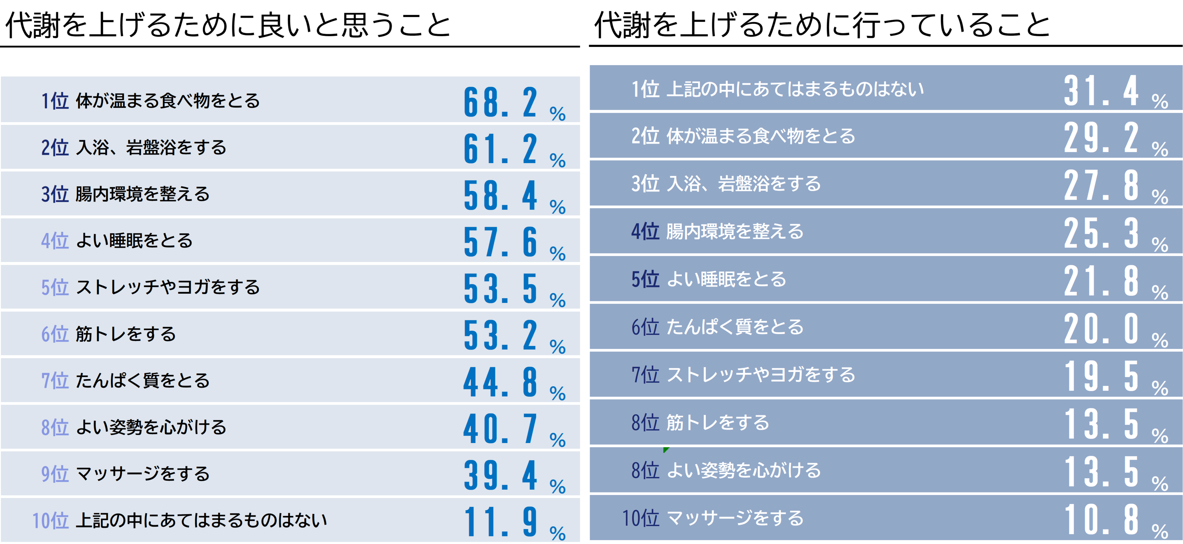 まず代謝を上げるために良いと思うことについては、「体が温まる食べ物をとる」が68.2%と最も多く、「入浴、岩盤浴をする」が61.2%、「腸内環境を整える」が58.4%と続きます。