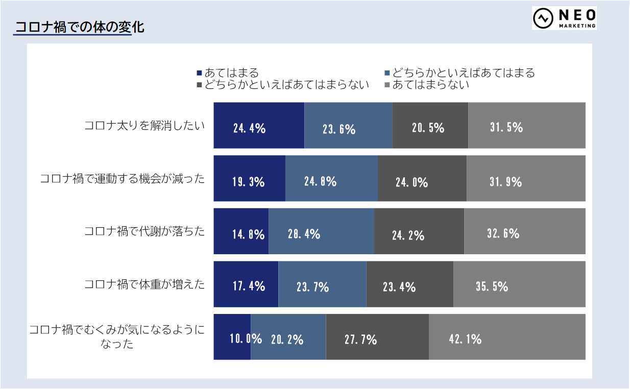 また、「コロナ禍で運動する機会が減った」「コロナ禍で代謝が落ちた」「コロナ禍で体重が増えた」について、あてはまると回答した方も、いずれも4割を超える結果となっています。