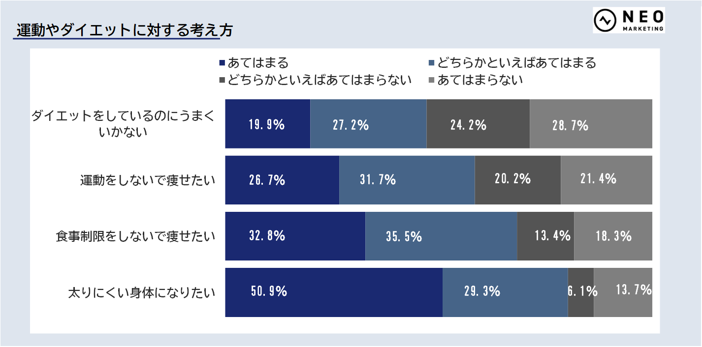 「ダイエットがうまくいっていない」ことに課題を持っている一方で、「運動をしないで痩せたい」、「食事制限をしないで瘦せたい」という思いを多くの方が持っていることがわかった。