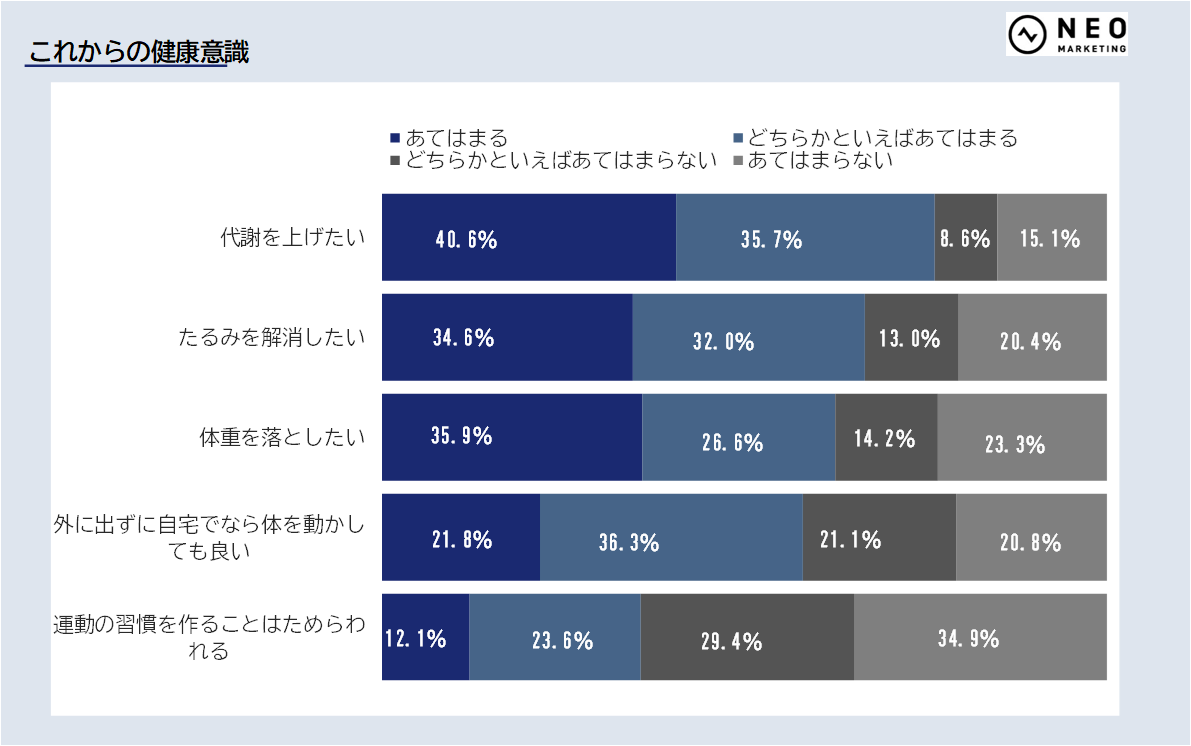 多くの方が、コロナ禍において運動機会の減少、代謝の低下、体重の増加に課題を感じ、今後改善していきたいと思っていることがわかりました。