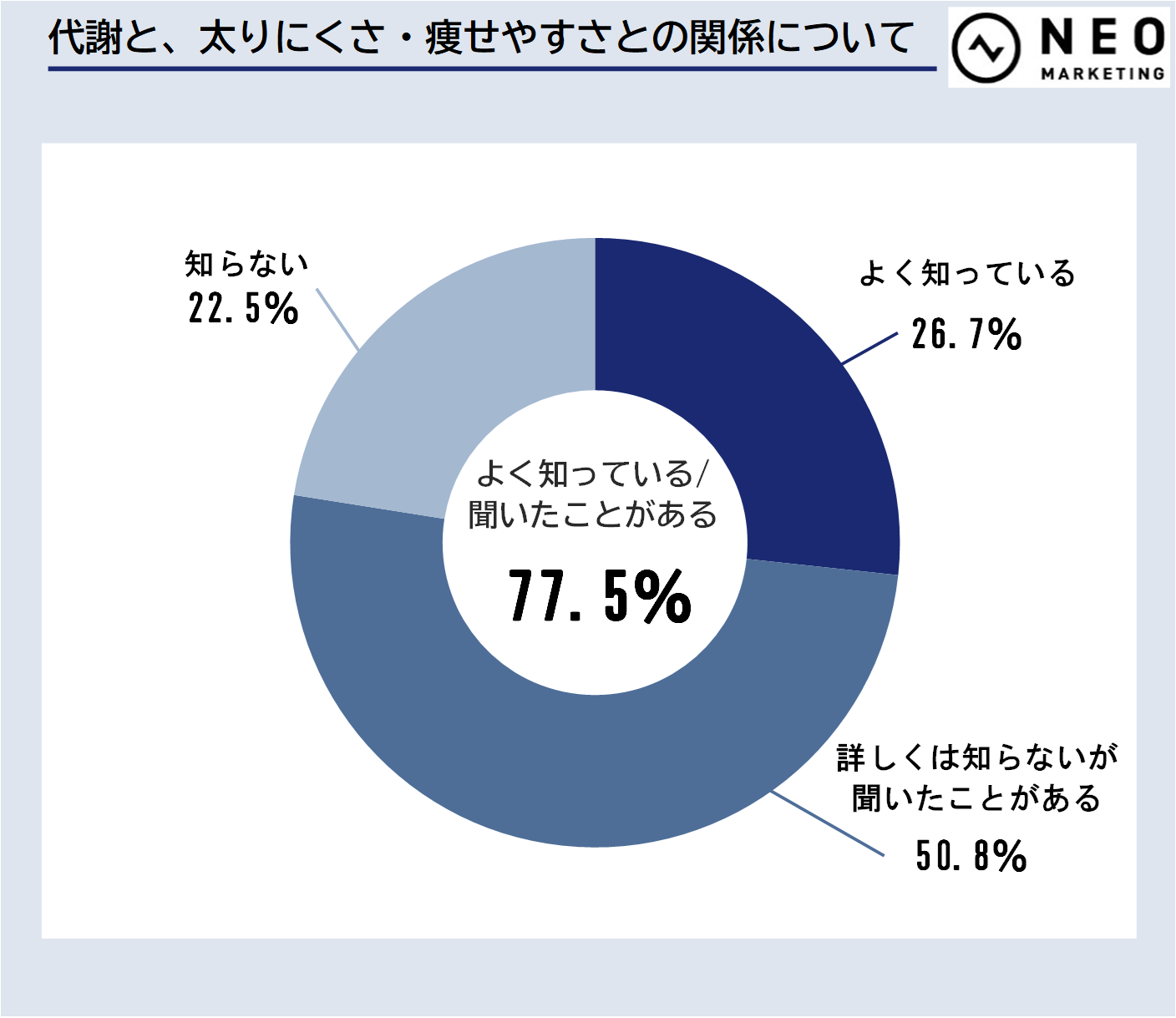 「よく知っている」が26.7%「詳しくは知らないが聞いたことがある」が50.8%となり、代謝を上げることがダイエットにつながることを知っている方は全体の77.5%となりました。