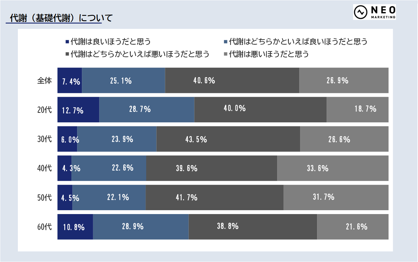 代謝について「悪いほうだと思う」「どちらかといえば悪いほうだと思う」と回答した方が、全体では67.5%と、役7割に迫る結果となりました。年代別で見ると、特に30代~50代が自身の代謝について悪いほうだと考えているようで、7割を上回る結果となりました。