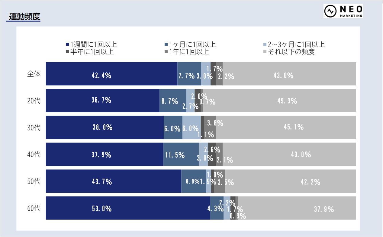 一方で、1年に1回以下の頻度でしか運動しないと回答した方は、全体では43.0%となっています。
