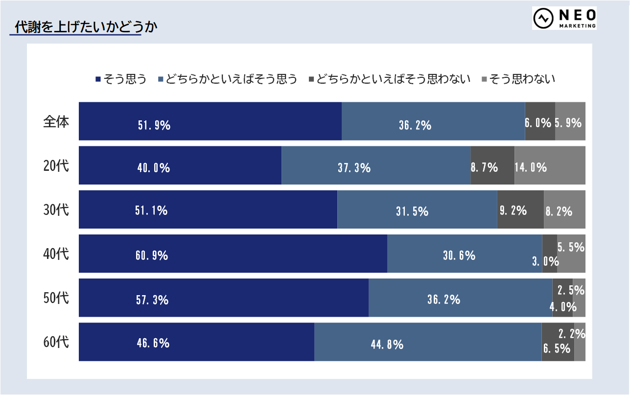 また、年代別で見ても、どの年代でも代謝を上げたいと回答している方が多く、特に40代以上は、9割以上が代謝を上げたいと回答しています。