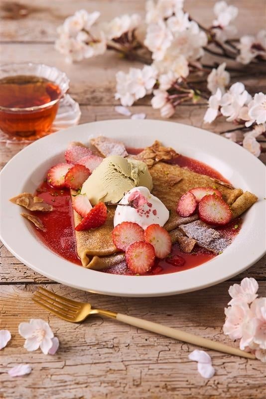 ご注文毎に焼き上げるクレープ生地に、ふんわりとさくらが香るさくらストロベリーソースをかけ、苺とピスタチオアイス、桜の花をトッピング。