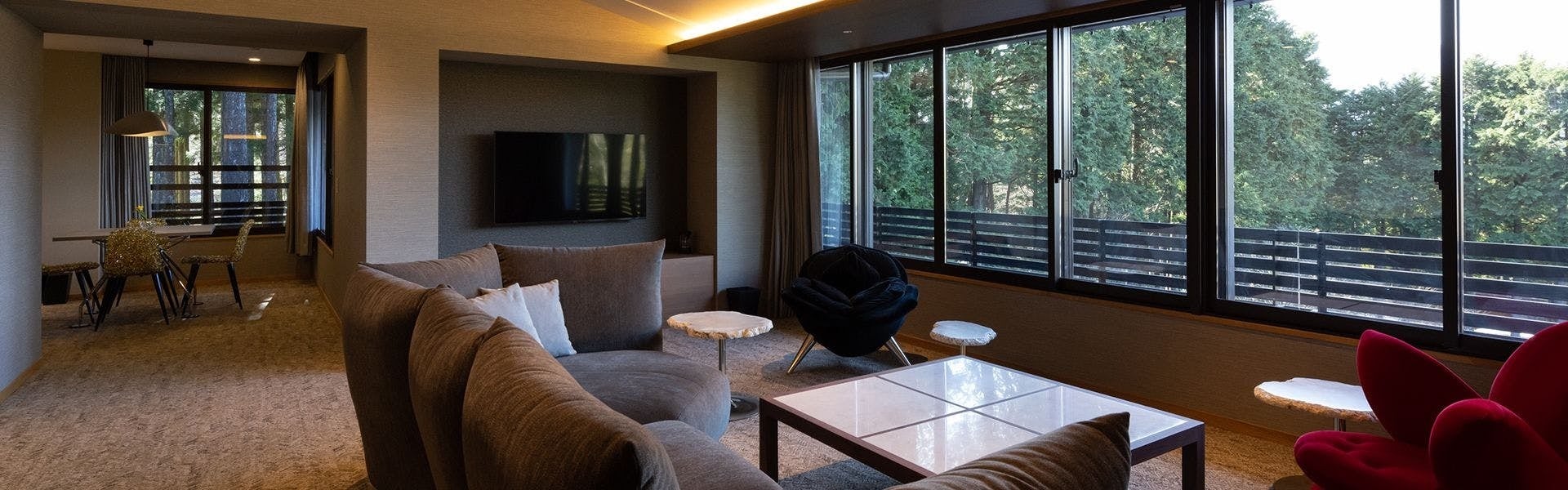 2024年2月開業。1,000坪の庭園に囲まれたわずか5室のお宿で、日々の喧騒からはなれ、ゆったりとした時間を過ごすことができます。お部屋はどれも92平米を超えるオールスイート。全ての客室でドライサウナや水風呂、大涌谷温泉を楽しめます。シンプルでシックな空間には、「Edra」や「Bonaldo」など、洗練されたイタリアのハイエンド家具を配置し、お部屋ごとに趣が異なるのも魅力のひとつ。旅慣れた一休会員からのクチコミも好評で、客室や食事、温泉、接客のすべてにおいて満足度の高い評価を得ています。箱根仙石原の豊かな自然に癒され、非日常を味わえるスモールラグジュアリーホテルです。