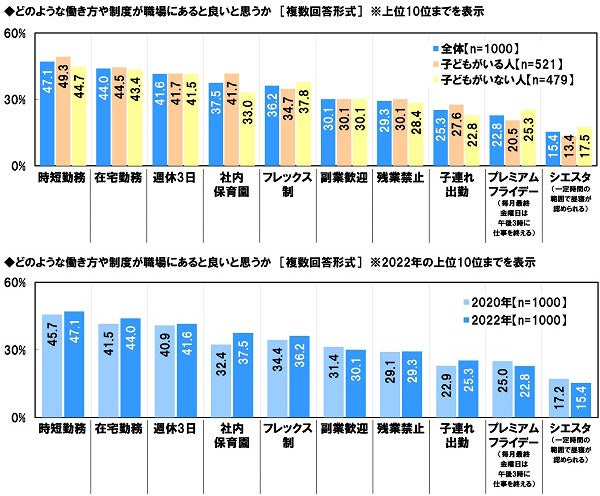 全回答者(1,000名)に、どのような働き方や制度が職場にあると良いと思うか聞いたところ、「時短勤務」(47.1%)が最も高く、次いで、「在宅勤務」(44.0%)、「週休3日」(41.6%)、「社内保育園」 (37.5%)、「フレックス制」(36.2%)となりました。