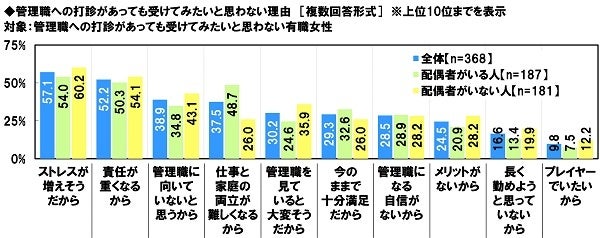 管理職への打診があっても受けてみたいと思わない有職女性(368名)に、その理由を聞いたところ、「ストレスが増えそうだから」(57.1%)が最も高く、次いで、「責任が重くなるから」(52.2%)、「管理職に向いていないと思うから」(38.9%)、「仕事と家庭の両立が難しくなるから」(37.5%)となりました。管理職になると精神的な負担が増すとイメージしている人が多いようです。
