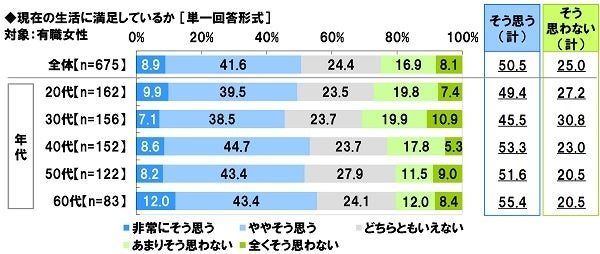 有職女性(675名)に、現在の生活に満足しているか聞いたところ、「非常にそう思う」は8.9%、「ややそう思う」は41.6%で、合計した『そう思う(計)』は50.5%、「全くそう思わない」は8.1%、「あまりそう思わない」は16.9%で、合計した『そう思わない(計)』は25.0%となりました。