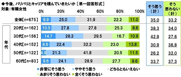 今後、バリバリとキャリアを積んでいきたいか聞いたところ、『そう思う(計)』は35.0%、『そう思わない(計)』は33.2%となりました。