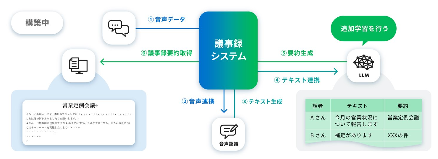 打ち合わせなどで録音した音声をテキストに変換し、LLM(大規模言語モデル)を活用して議事録内容を要約するシステムの内製開発に取り組んでおり、本年度中のリリースを目指しております。テキスト変換で失敗 しやすい社内用語などを正しいテキストに変換する追加学習機能も実装予定です。
