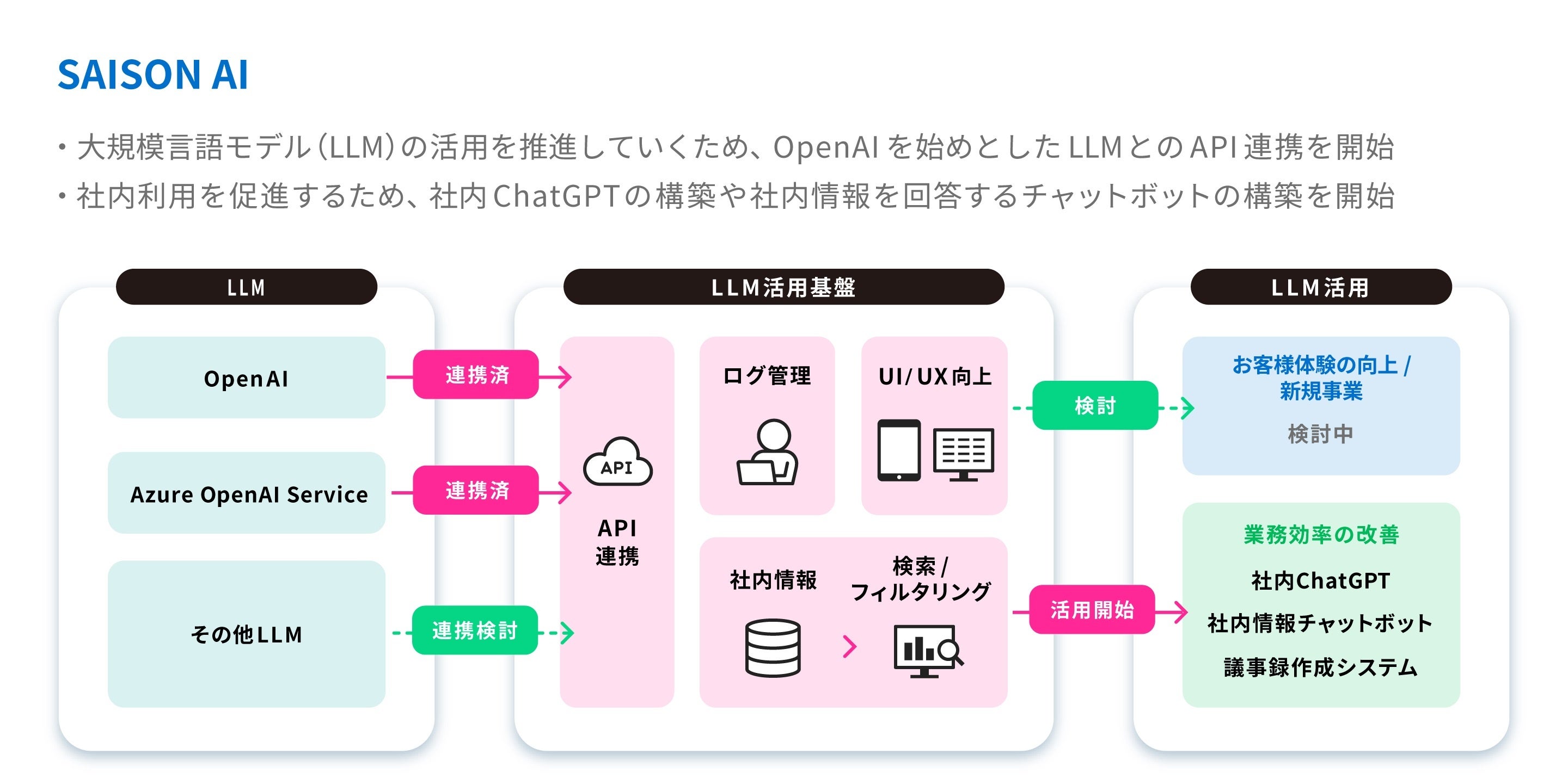 全社員約4,000人を対象に、2023年11月よりAIアシスタントサービス「SAISON ASSIST」の提供を開始、12月より社内情報回答チャットボット「アシストくん」のテスト運用を開始しています。また、2024年度中には、議事録作成システムの導入を予定しております。