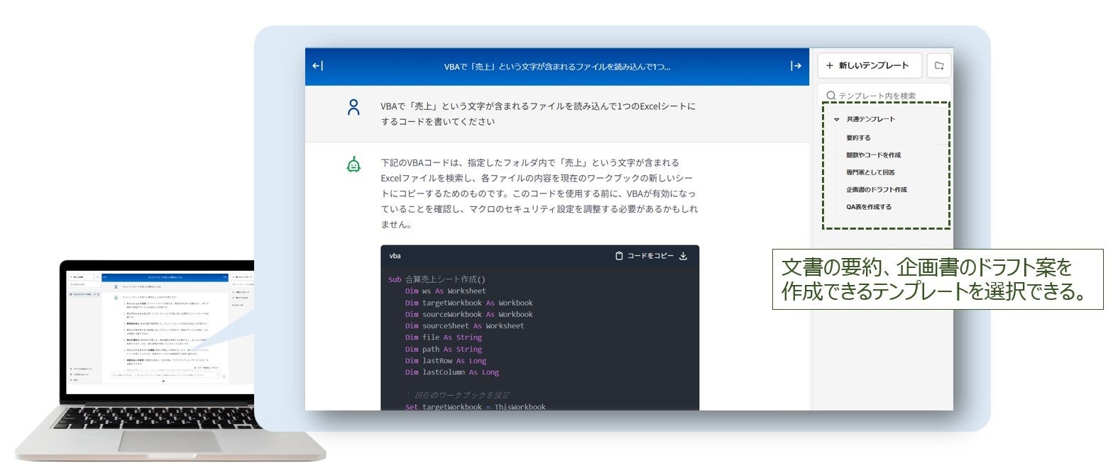 OpenAI API/Azure OpenAI Serviceと連携したAIアシスタントを内製開発し、文章の要約や企画アイデアの検討などへの活用を推進しています。よく利用されるプロンプトについては、テンプレート化することで、社員が活用する際の時間短縮を実現しています。