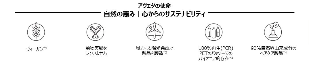 *4 自然界由来成分とはISO16128の自然由来原料の定義に基づいたもので、成分の由来の大半が植物、非石油系ミネラルまたは水であることを意味します。また90%はアヴェダヘアケア製品のアヴェダが算出したおおよその値です。