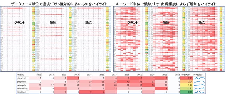 ※注目キーワード:対象領域のイノベーションの動きを特定するため、グラント、特許、論文データからテキストマイニングによって抽出した、時系列変化に特徴がみられるキーワード