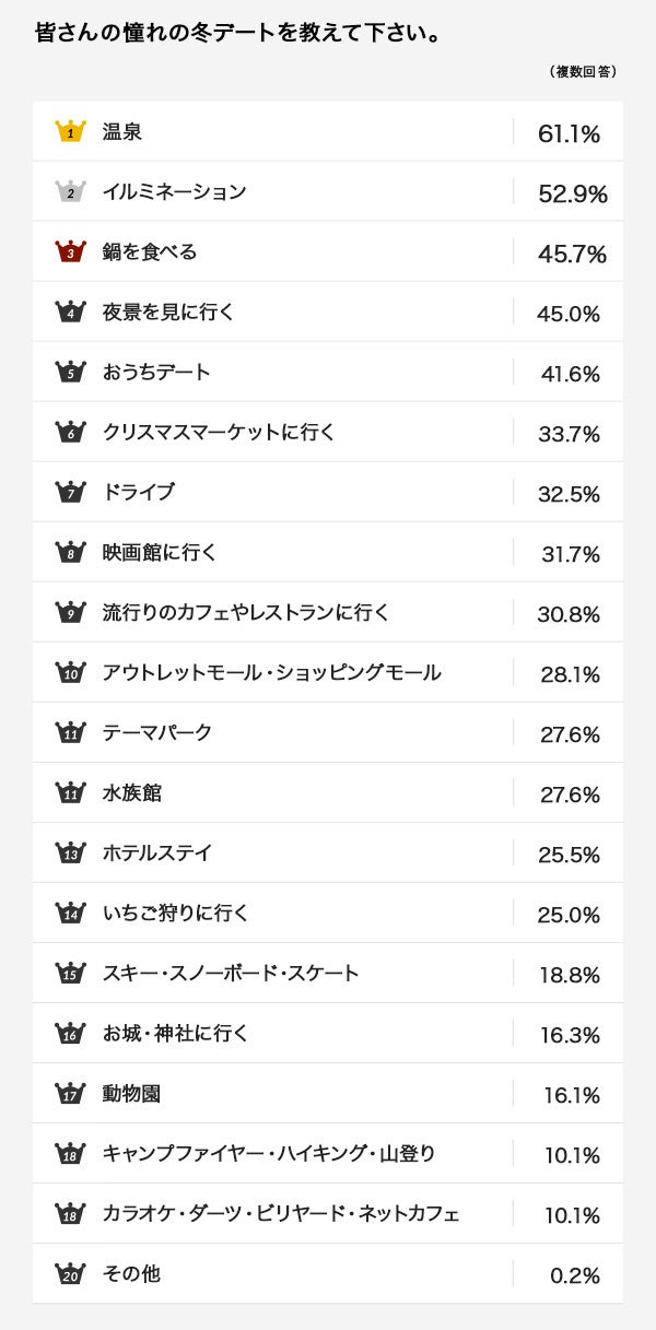 続いてのアンケートでは、皆さんの憧れの冬デートをお尋ねしました。こちらは20の選択肢から複数回答で答えていただきましたので、結果をご覧ください。