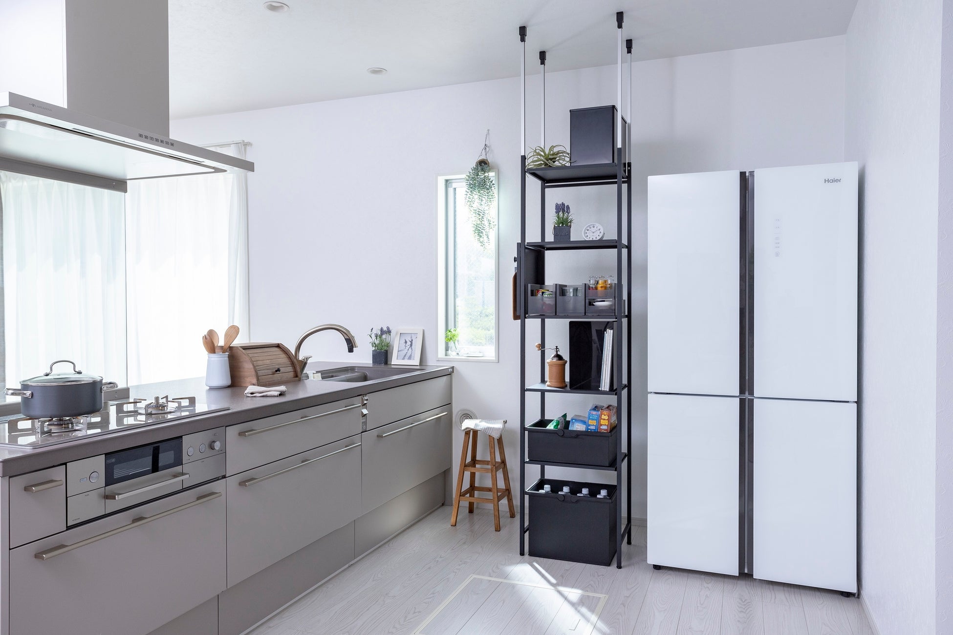 突っ張り アイランドシェルフと付属品の設置例