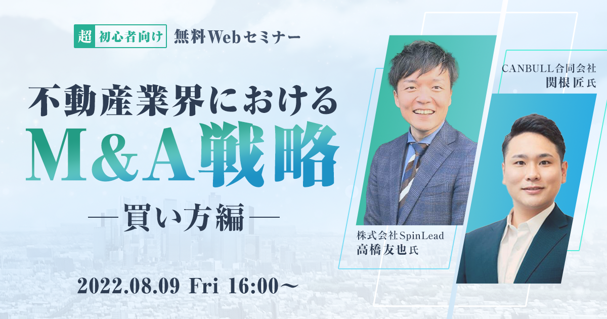 特別ゲスト講師に不動産業界特化で事業成長支援をしてきた株式会社SpinLead(本社:東京都港区)代表取締役の高橋氏、不動産会社向けM&Aコンサルの実績が多数のCANBULL合同会社(本社:東京都港区)代表取締役の関根氏を迎えて、事業成長にドライブをかけるシナジー性の高いM&A戦略についてディスカッションしていただきます。