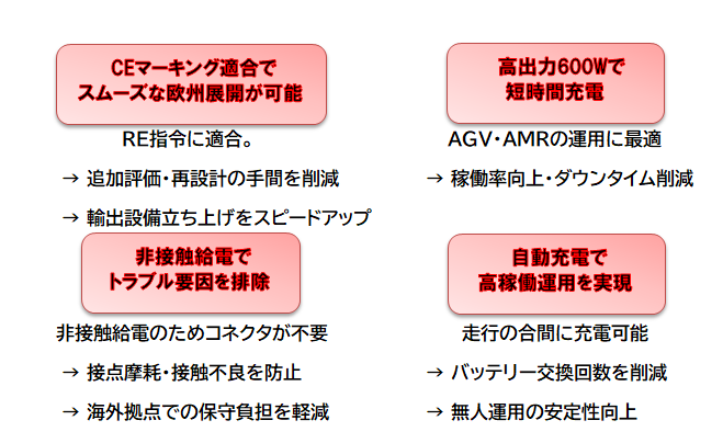 さらに、120W~2000Wクラスの給電により短時間での充電が可能となり、設備全体の稼働率向上に
