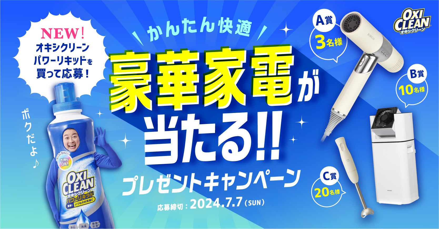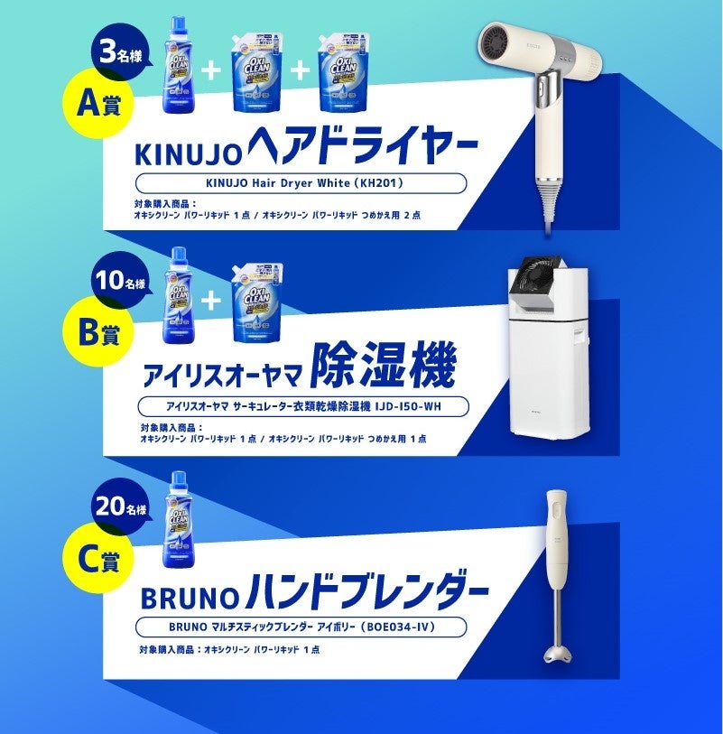 「オキシクリーン パワーリキッド」「オキシクリーン パワーリキッド つめかえ用」をご購入いただいた方を対象に、抽選で人気家電が当たるキャンペーンです。レシートなどの購入証明をWEB上の応募フォームでお送りいただいたお客様から抽選を実施します。