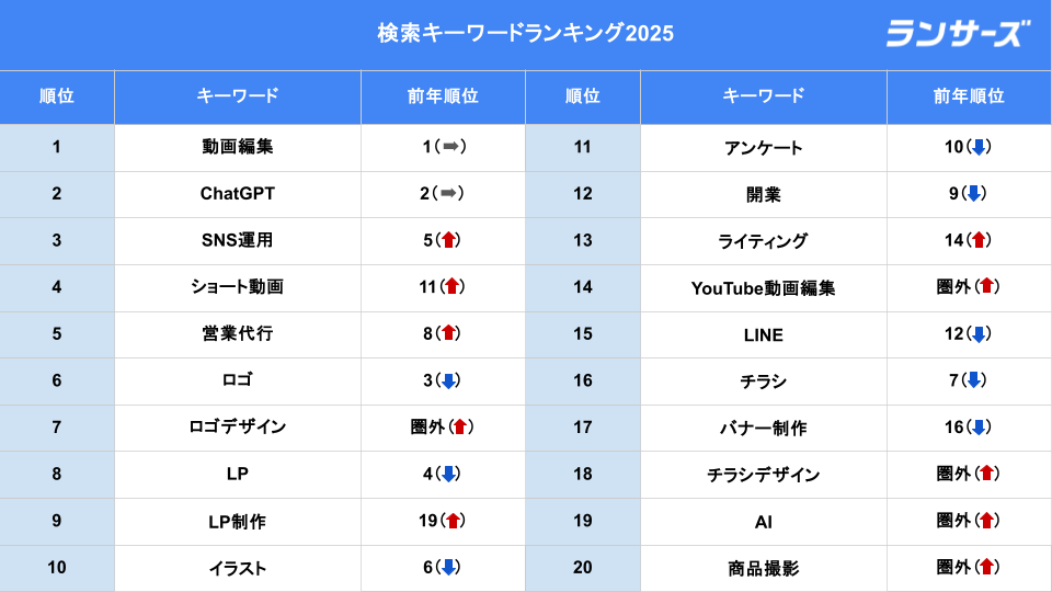 「動画編集」(1位)、「ショート動画」(4位)、「YouTube動画編集」(14位)、「SNS運用」(3位)など、動画・SNS関連のキーワードが多数上位に入りました。