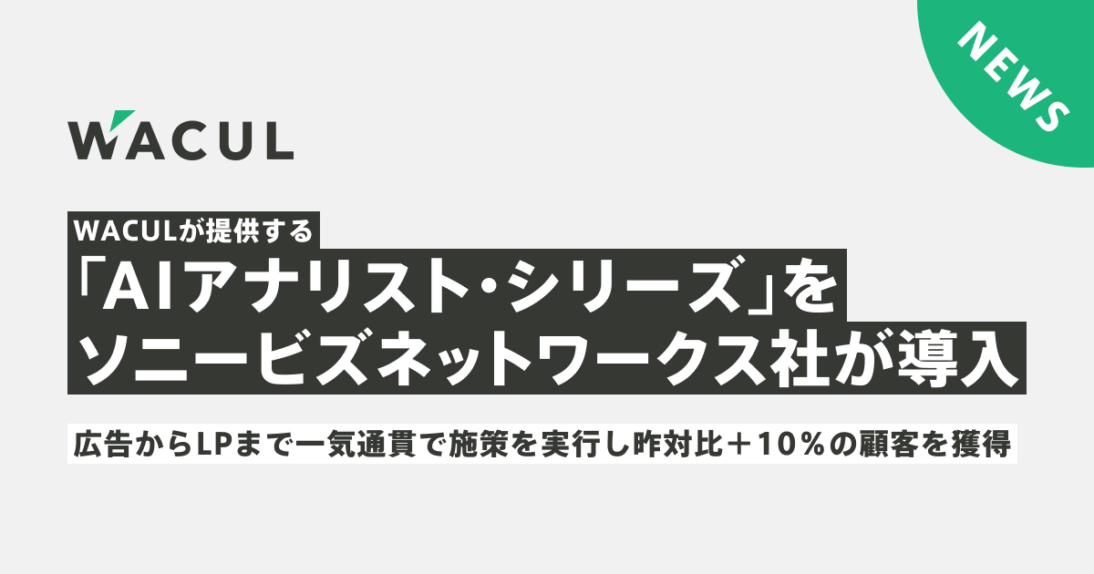 データ分析ツール「AIアナリスト」でマーケティングDX を自動化する株式会社WACUL(読み:ワカル、代表取締役社長:大淵 亮平、以下当社)は、ソニービズネットワークス株式会社がAIアナリスト・シリーズの「AIアナリスト」「AIアナリストAD」を導入したことをお知らせします。広告からサイト内まで一気通貫で施策を実行した結果、昨対比+10%改善いたしました。