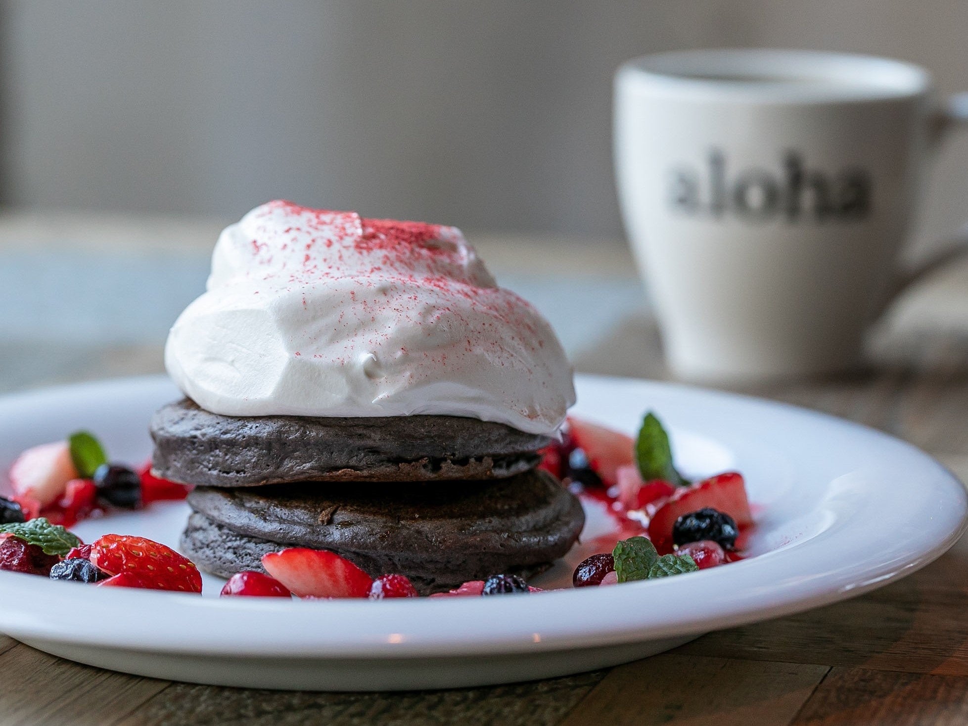 アロハテーブルの定番であるハワイアン・パンケーキは、全粒粉を使用しており、小麦の風味ともちもちした食感が特徴です。今回はハワイアン・パンケーキをバレンタインデースペシャル仕様にアレンジしご用意しました。