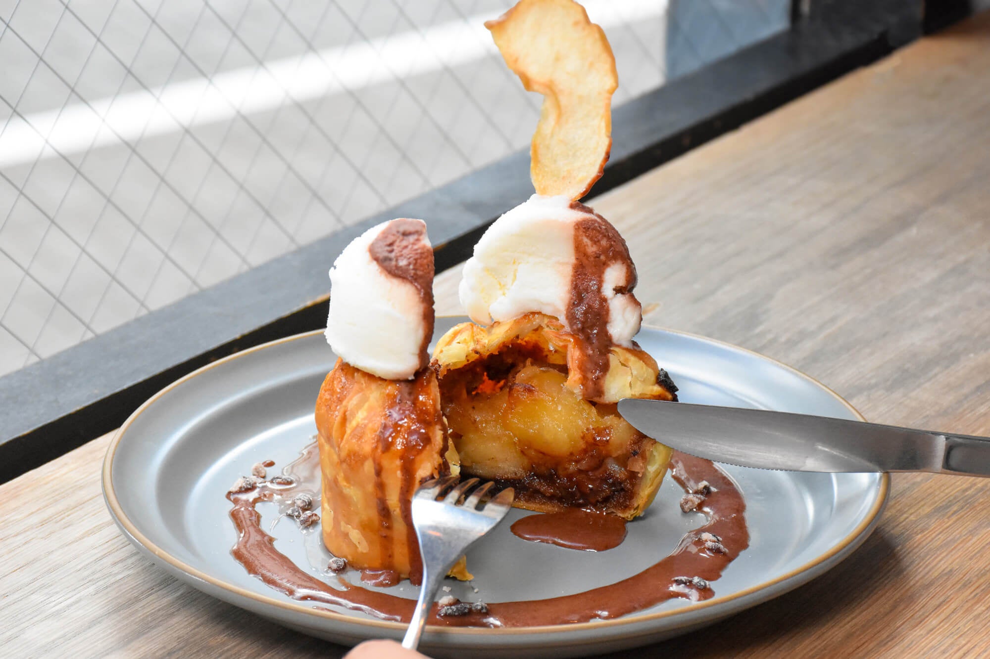 サクサクのパイ生地と旬の甘酸っぱいりんごのソテー、そして芳醇な風味のチョコレートのハーモニーを存分にお楽しみください。