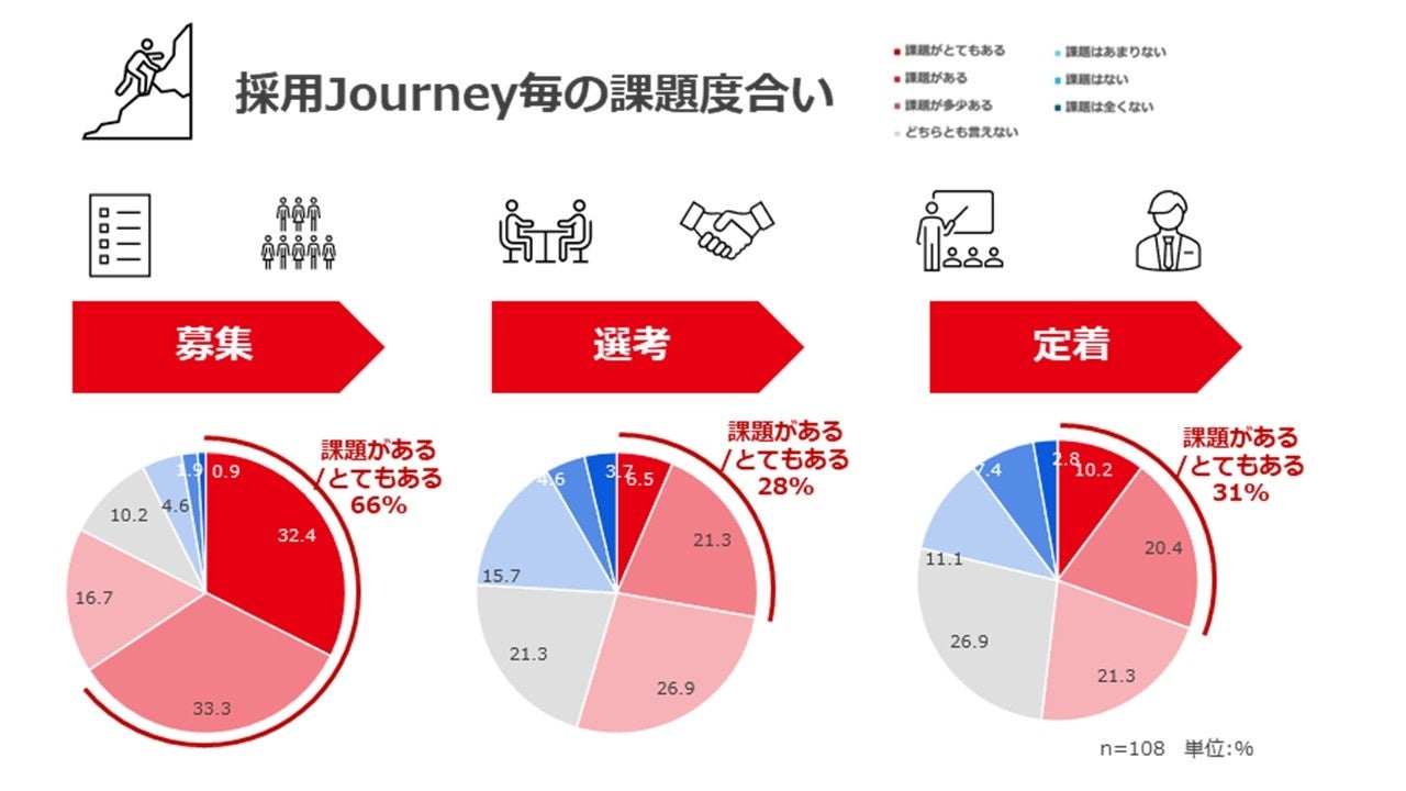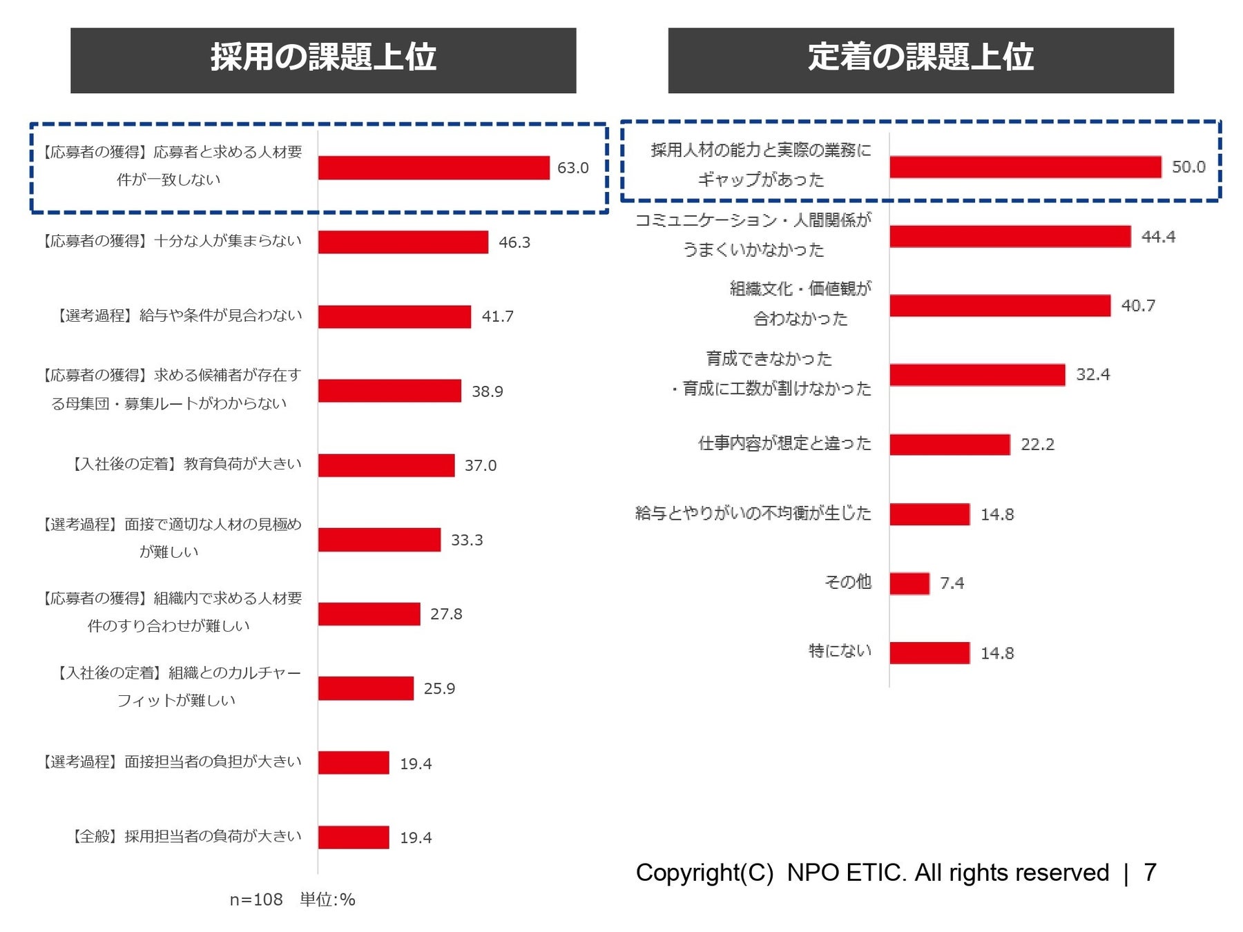 調査の結果、回答した団体の多くが、募集・選考・定着の各フェーズで課題を抱えており、特に募集段階において「応募者と求める人材要件が一致しない」と答える団体が6割を超えていました。