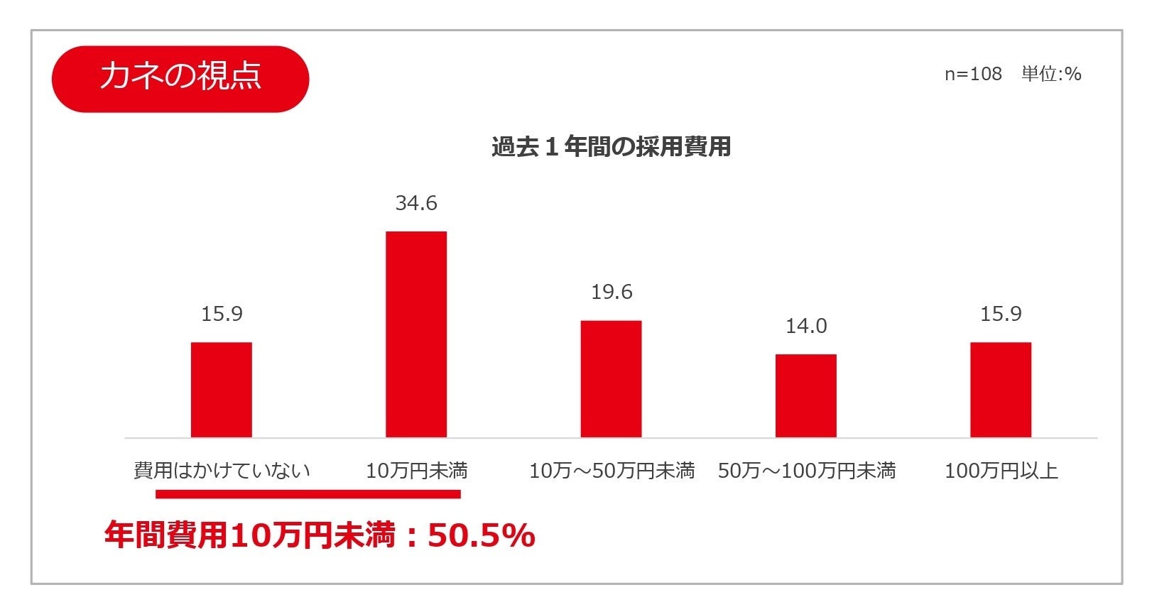 採用費用は、約50%の組織が年間10万円未満の一方で、30人以上組織の中では100万円を超える組織も37%存在。しかし予算の大小により、採用に関する課題感の大きさに違いは見られなかった