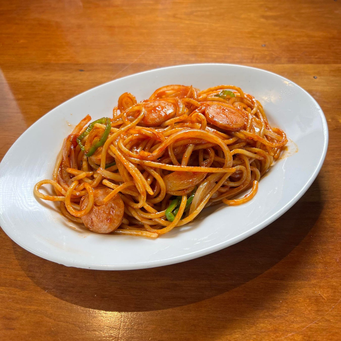 王道のナポリタン。ソースが絡む太麺のパスタとたっぷりの具材でボリューム満点です。