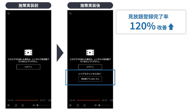 無料動画の再生後、有料の次話に遷移した際に表示されるダイアログに、「見放題プランはこちら」というCTAボタンを追加。加えて、マイクロコピーは「いつでもキャンセルOK!」という解約の簡単さを訴求する内容に。結果、CVR(見放題登録完了率)は約120%改善しました。